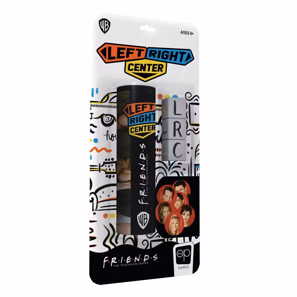 A long-time family and party favorite, Left Right Center (LRC) is an easy-to-learn dice game anyone can play and win! Roll the dice, move the tokens. The last player with tokens takes home the prize! In this edition, play with Friends-themed dice, tokens, and travel-friendly tube, making this game a sure bet for fun at your next gathering.