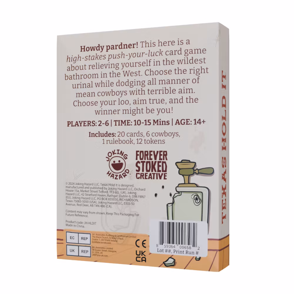 Howdy pardner! This here is a high-stakes push-your-luck card game about relieving yourself in the wildest bathroom in the West. Choose the right urinal while dodging all manner of mean cowboys with terrible aim. Choose your loo, aim true, and the winner might be you!