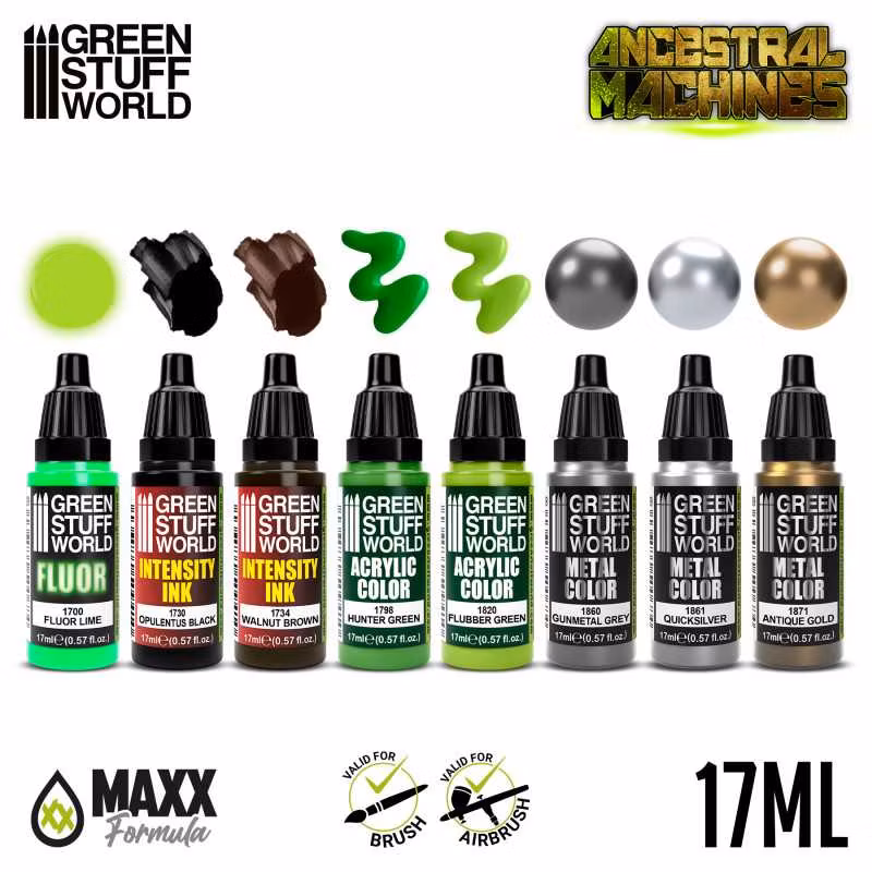 Selection of Maxx formula paints and other effect paints for painting Necrons and other similar types of futuristic robots from Green Stuff World.