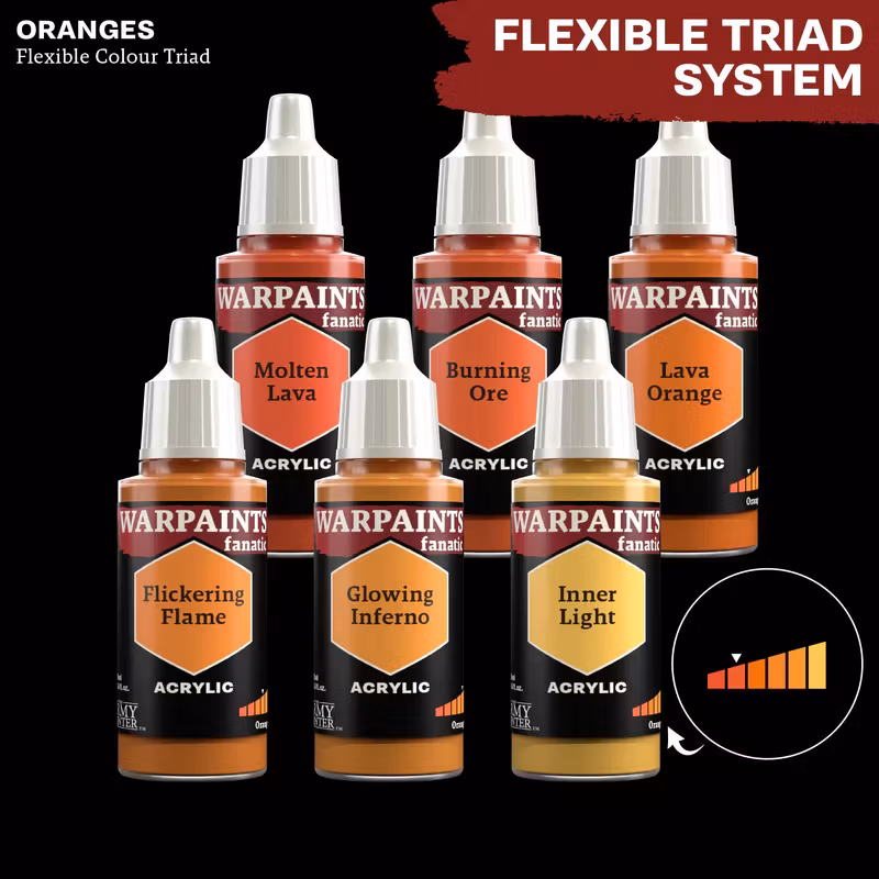 The Warpaints Fanatic: Burning Ore is a vivid reddish orange that works nicely as an orange base coat. It’s the second-darkest tone from the “Oranges” Flexible Colour Triad and its Practical Colour Name is “Vivid Reddish Orange”.