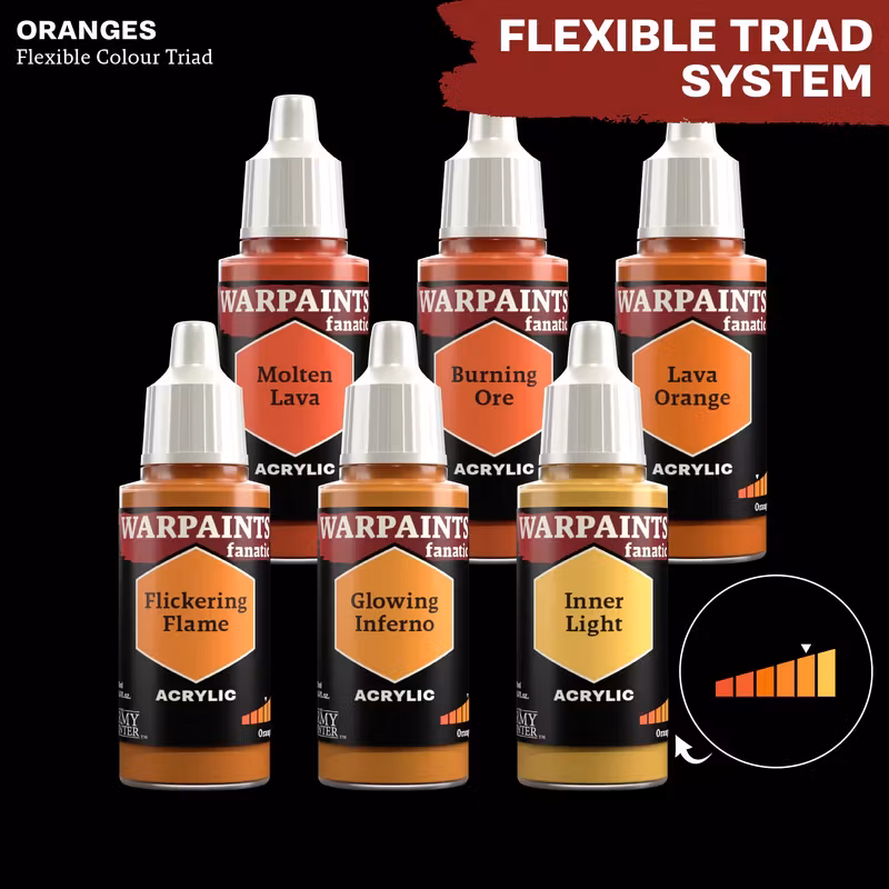 The Warpaints Fanatic: Glowing Inferno is a brilliant orange that is suitable as a light layer or highlight. It’s the second-lightest tone from the “Oranges” Flexible Colour Triad and its Practical Colour Name is “Brilliant Orange”.