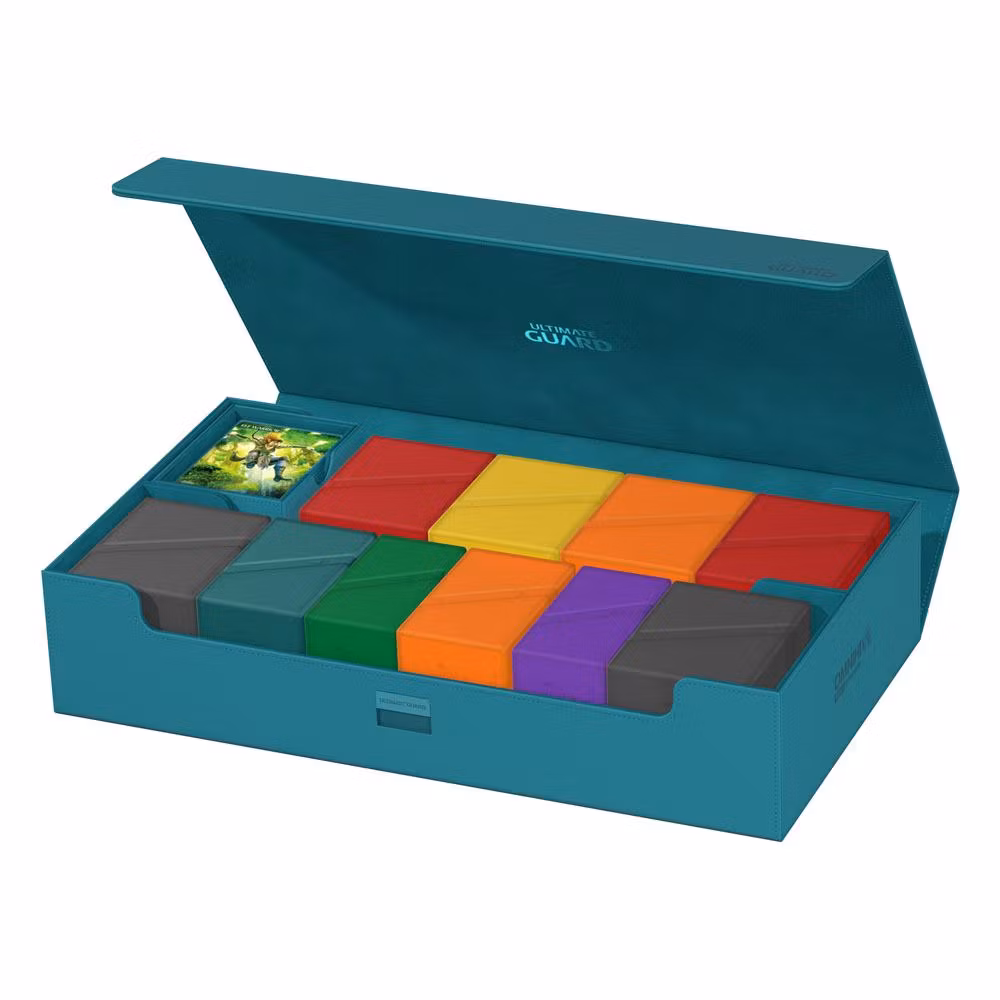Introducing the new Omnihive 1000+! The ultimate spacious and flexible box for storing large collections. This box can hold more than 1000 double- sleeved cards or carry multiple decks and/or Play-Mats plus other Ultimate Guard products like the Sidewinder 133+. Two removable, magnetic, adjustable and stackable trays make this box unique: it's adaptable for all kinds of games and formats and enables multiple different ways of storing and using your collection.